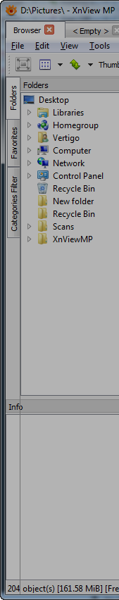Some of the time when this has happened the tabs on the left (Folders, Favorites, Categories Filter) have become inactive, where clicking them does nothing. Some (all?) of the time the arrows in the properties pane that expand/collapse the categories (File, Image, Camera) can't be clicked, seemingly due to their location to the left of the line, which it seems is a broken area; however, it's currently broken and I can't click those arrows, but the tabs previously mentioned can be clicked. I tried moving the preview pane where the info pane is, to see if it would fix the problem, but I accidentally dropped it on it instead of to the left of it and it put the two in the same spot with tabs to select which one is active. When the preview is active, clicking on it to the left of the line does nothing, which is the same behavior as with the arrows in the info pane, but clicking to the left of the line on the tab to switch to the preview pane works. However, when the info pane is active, and the tabs on top of it (Properties, Histogram, EXIF, etc) are showing, clicking to the left of the line on the properties tab doesn't work. The double arrow mouse cursor that shows when between panes, for resizing them, also doesn't work in this area. So some stuff "behind" it is broken and some stuff isn't. And while the arrows to collapse/expand the categories and the info pane properties tab (to the left of the line) are both inactive, the arrows light up when hovering the mouse over them, but the tab does not. So while they're both inactive, for some reason the arrows still react somewhat to the mouse, whereas the tab doesn't at all. I then moved another pane into its place (this time being sure to drop it to the left of it so it shifted the info/preview pane over and actually took its place) and the line stayed in the same spot, this time overlying the new pane, which is also broken behind the line.