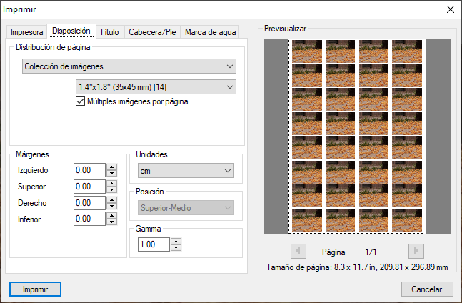Menu File, Print, tab Layout, Page layout: Pictures collection, field Format: option 1.4"x1.8" (35x45 mm) [14].