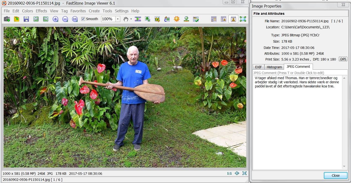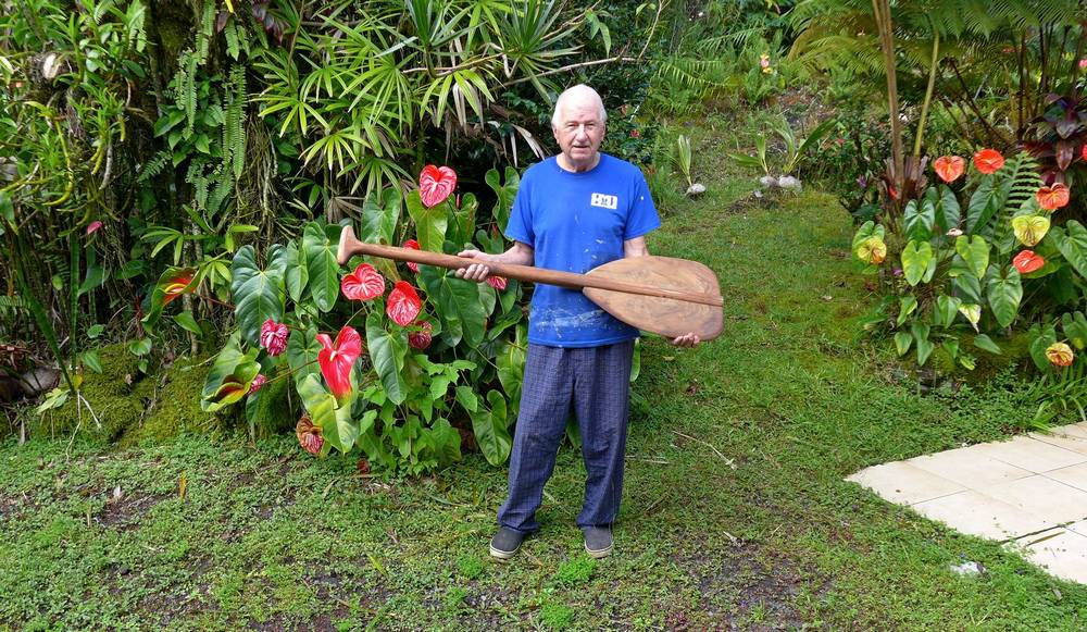 Vi tager afsked med Thomas. Han er t�mrer/snedker og arbejder stadig i sit værksted. Hans sidste v�rk er denne paddel lavet af det eftertragtede hawaiianske koa tr�.