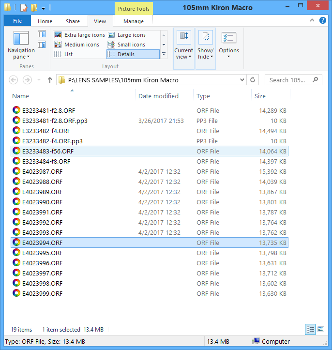 The filetypes vary, including ORF, .pp3 (RawTherapee edits), .jpg, & .txt.