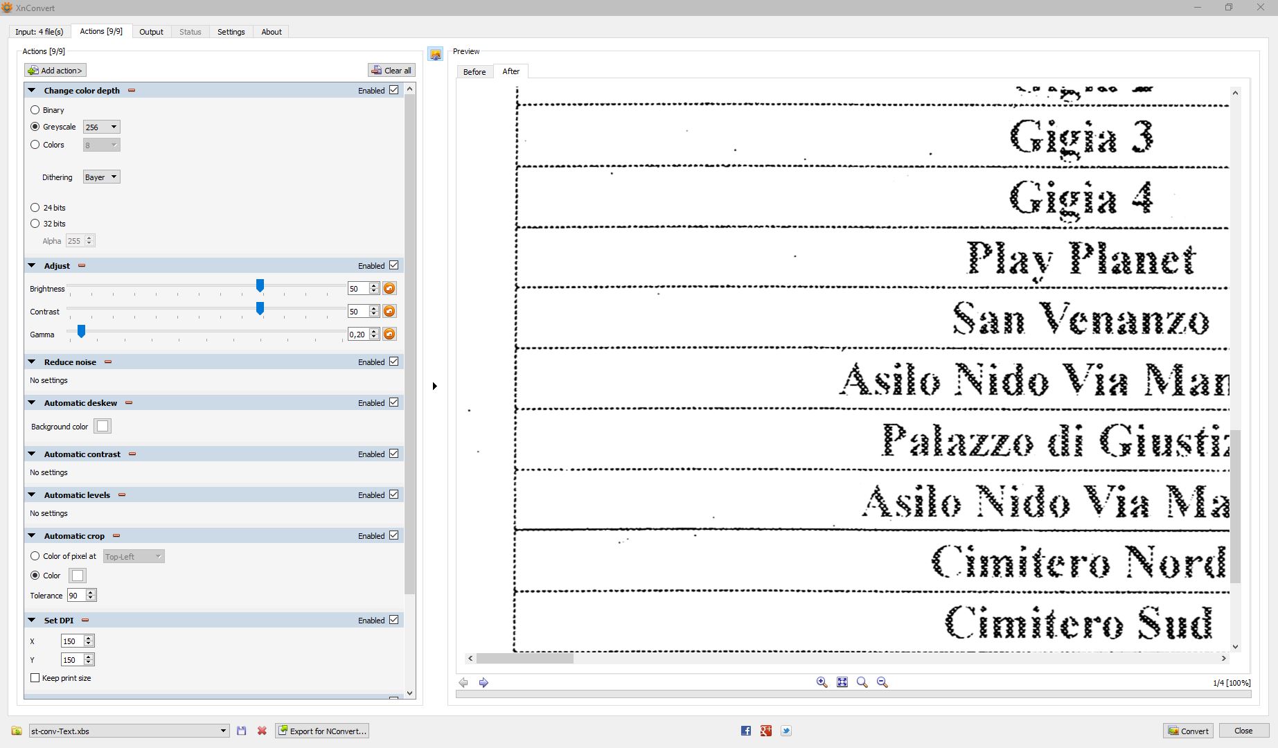 here's my latest configuration version for XnConvert when "cleaning" scans. the greatest differences i did find in the past was moving the reduce noice below normalize EX or adjust brightness. But even then in general i did find little difference. I don't know the algorithm for "reduce noise" but seems to work best on very low res. The scans i was working on right now were about 9500x6500 originally A3 scanned pages, then auto-cropped to their borders.