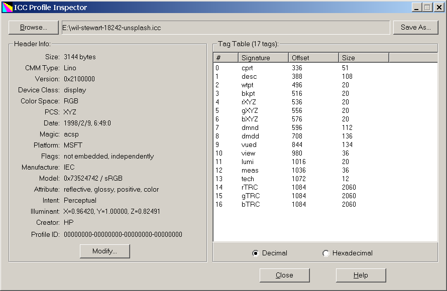 │ dmdd      │ 0x02c4 │ 0x0088 │ desc │ IEC 61966-2.1 Default RGB colour space - sRGB │