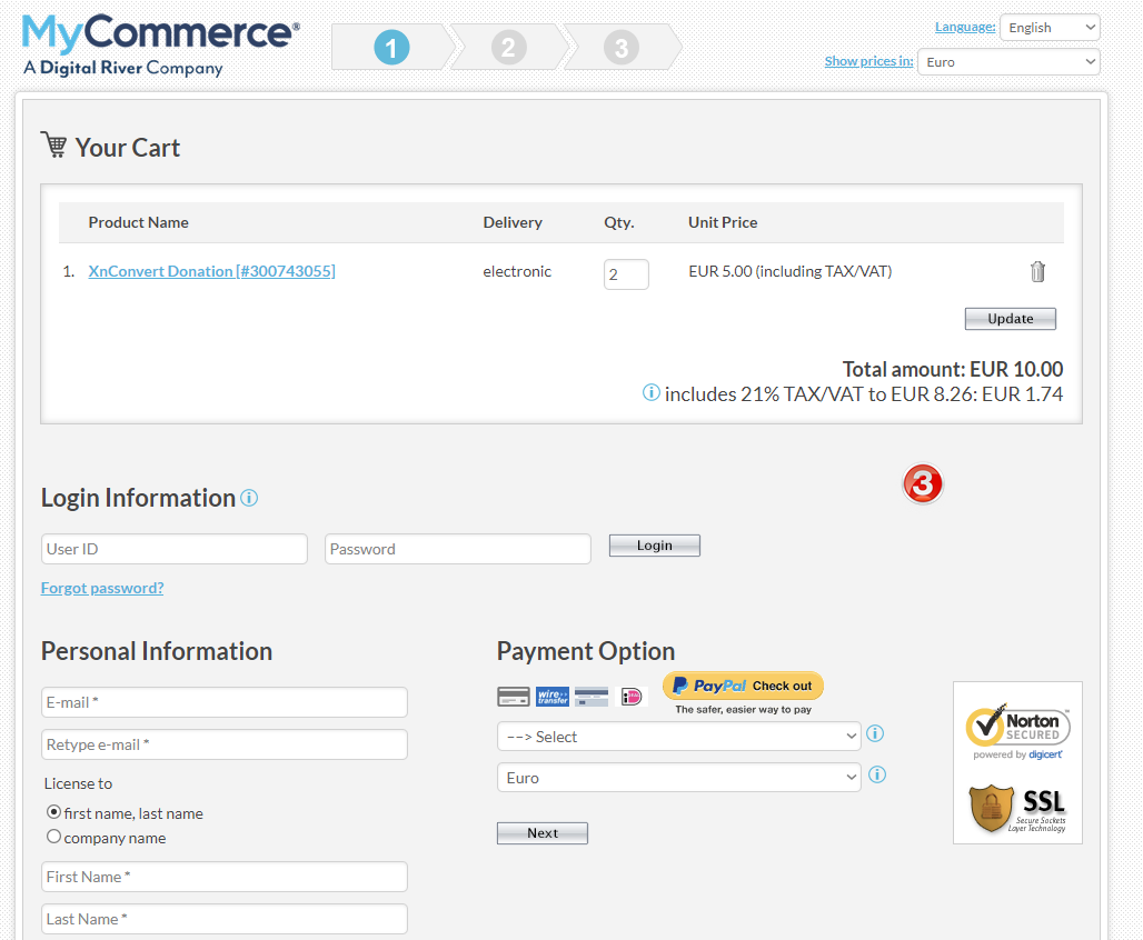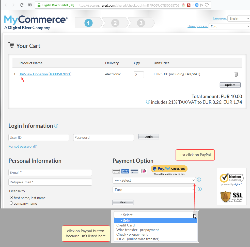 When clicking on 'Make a donation' (immediately after installing v0.93) I ended up in MyCommerce where I needed to pay for XnConvert 2x ??