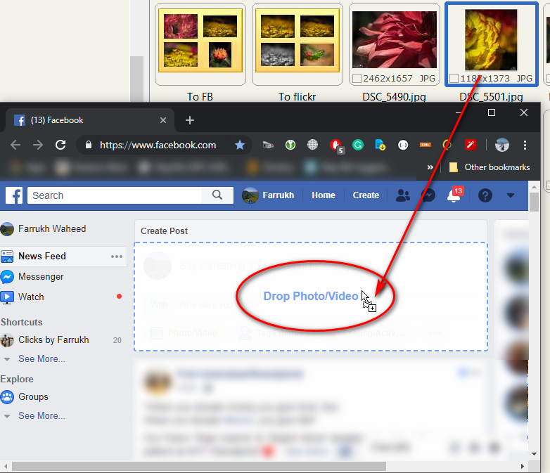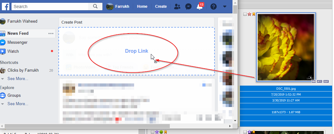 This creates a problem whenever I tried to post in photography groups. In groups, Facebook simply doesn't display images, neither any thumbnails, as if there was no image dropped or posted. While dragging and dropping through any other tool doesn't create this issue.