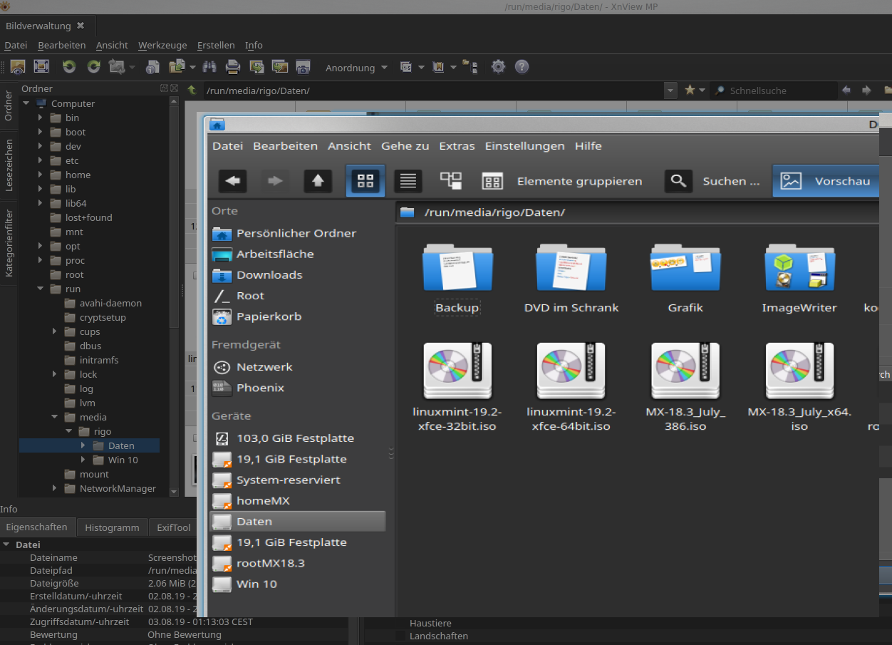 Nun war ich nicht untätig und habe verschiedene Sachen ausprobiert. Die Situation von obigem Bild entstand unter Mageia und installierten XNView aus dem Flatpak über Discover. Jetzt habe ich Netrunner ((netrunner-rolling-2019.04-64bit) baut auf Manjaro) installiert und habe XNView per AppImage gestartet, und siehe da ich fand meine Festplatten. In /mnt sind keine Laufwerke gemountet, aber in /run/media/rigo (ist halt so bei Netrunner). Von meiner Seite aus wäre ich damit zufrieden. Ich kann meine Dateien nun finden. Sollte das vielleicht noch für andere eine Hilfe sein, mit den TGZ-Dateien funktioniert es auch. Danke nochmals für Eure Hilfe und verbleibe mit freundlichem Gruß
