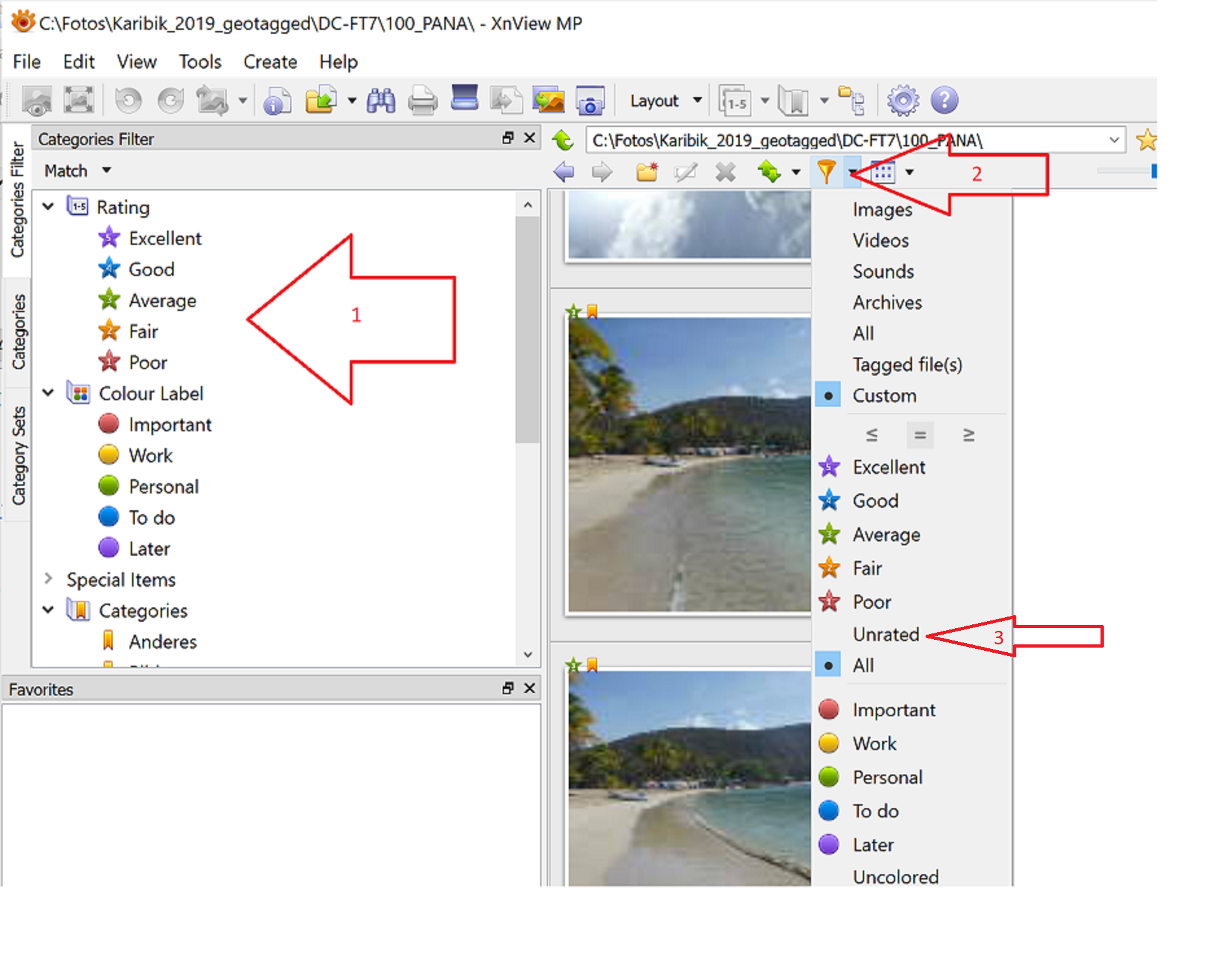 I make great use of the very efficient rating feature in XnViewMP (with the 1-5 colored stars) which allows easy filtering for any combination of star-ratings. However, I couldn't figure out yet how to show only the fotos which have no star-rating yet (because they are the ones I still have to look at and have to give a rating)
