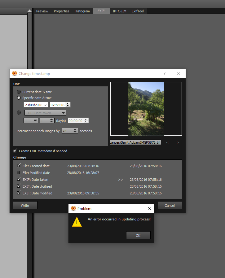 The change Timestamp tool works perfectly for JPEG images, but I systematically get an error message: "Problem - An error occurred in updating process!", when I try to use it on TIF files.