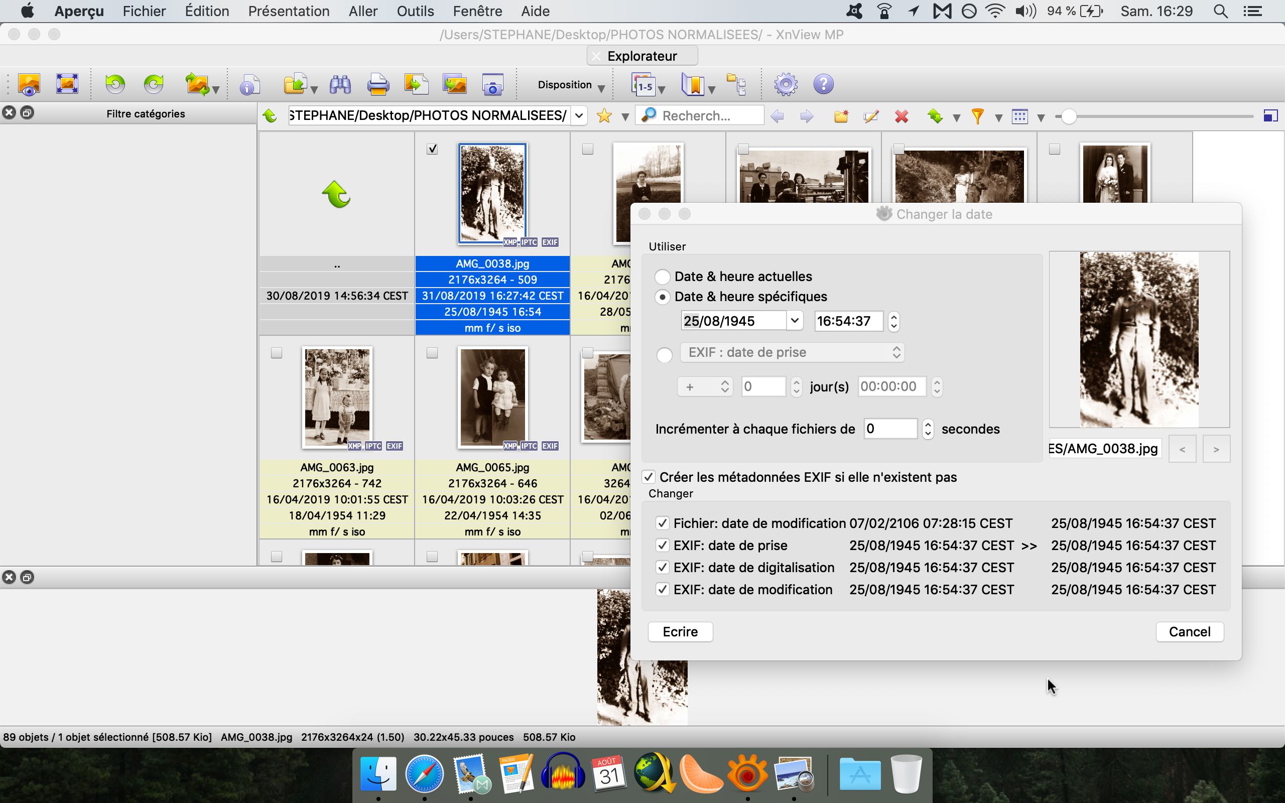 Bonjour, J'utilise XnView sous Mac. Le logiciel fonctionnait très bien jusqu'à présent, je m'en sert pour changer les dates de vieilles photos scannées (années 1940). Aujourd'hui quand je suis dans XnView la présentation des photos est la même, tout semble correct et les dates sont bonnes, mais quand j'enregistre sur le Mac celui-ci me met la date de modification comme date de création et la date du 7 février 2106 comme date de modification! Je n'arrive pas à trouver ce qui ne vas pas... Pouvez-vous m'éclairer? Merci.