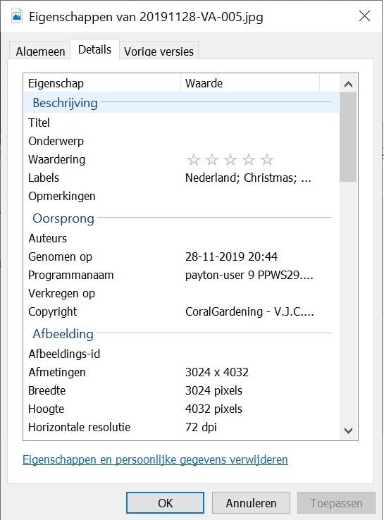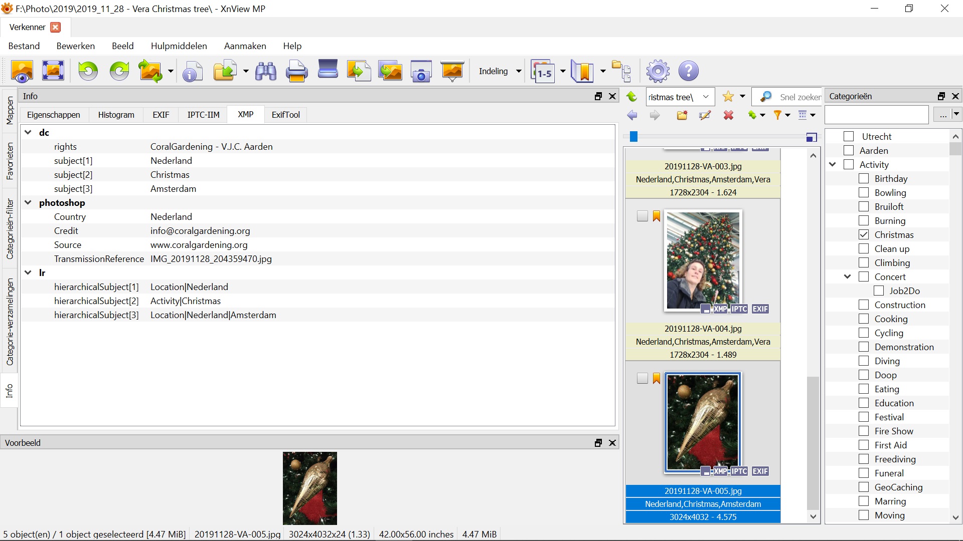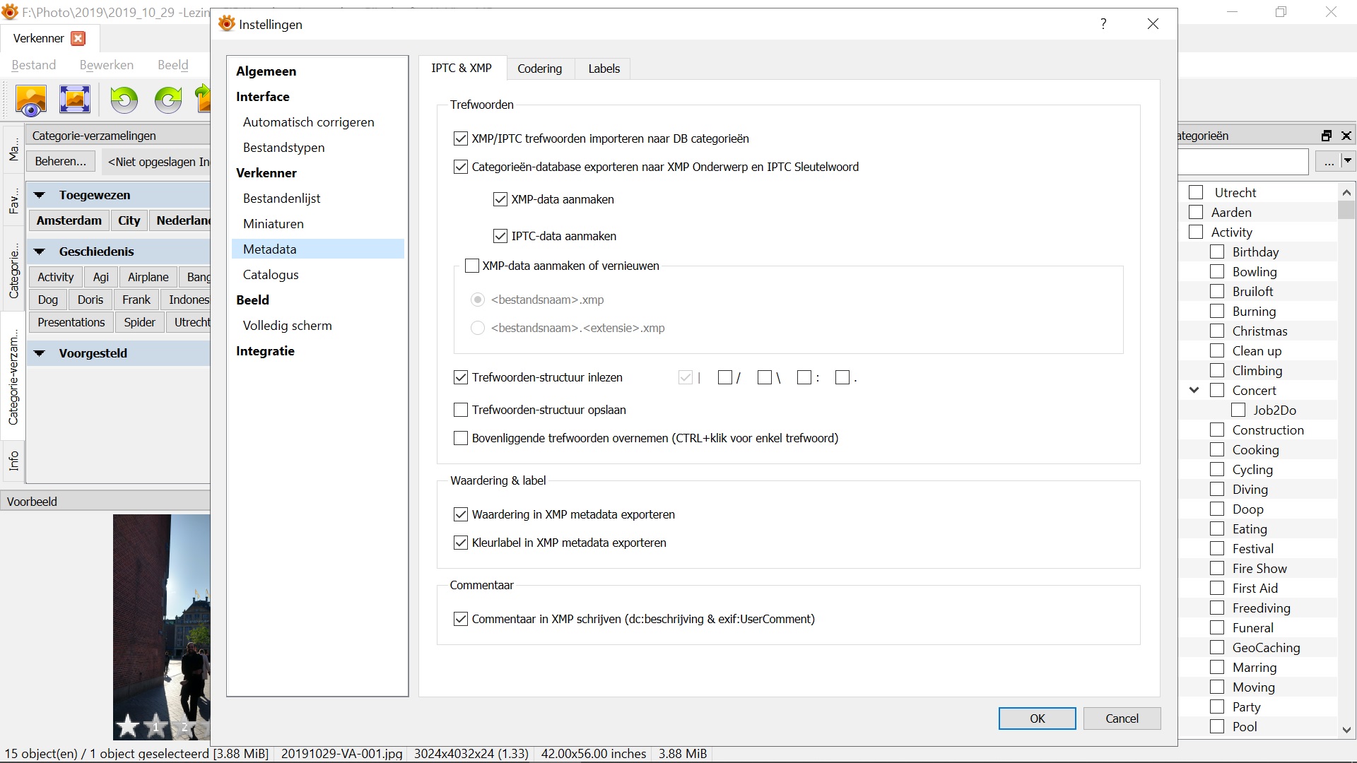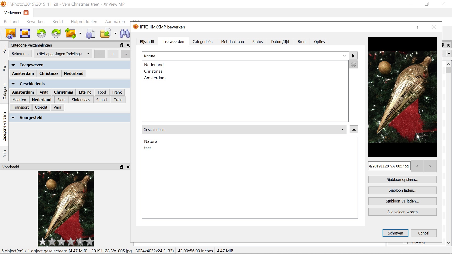 The problem doesn't always happen. Sometime it does and sometimes is doesn't. If the problem happens I have to reboot the computer. Closing XnView and startup again is not fixing the problem. Now I have imported my photo's and added the categories, so this is the info of a photo with the added categories, also in XnView: