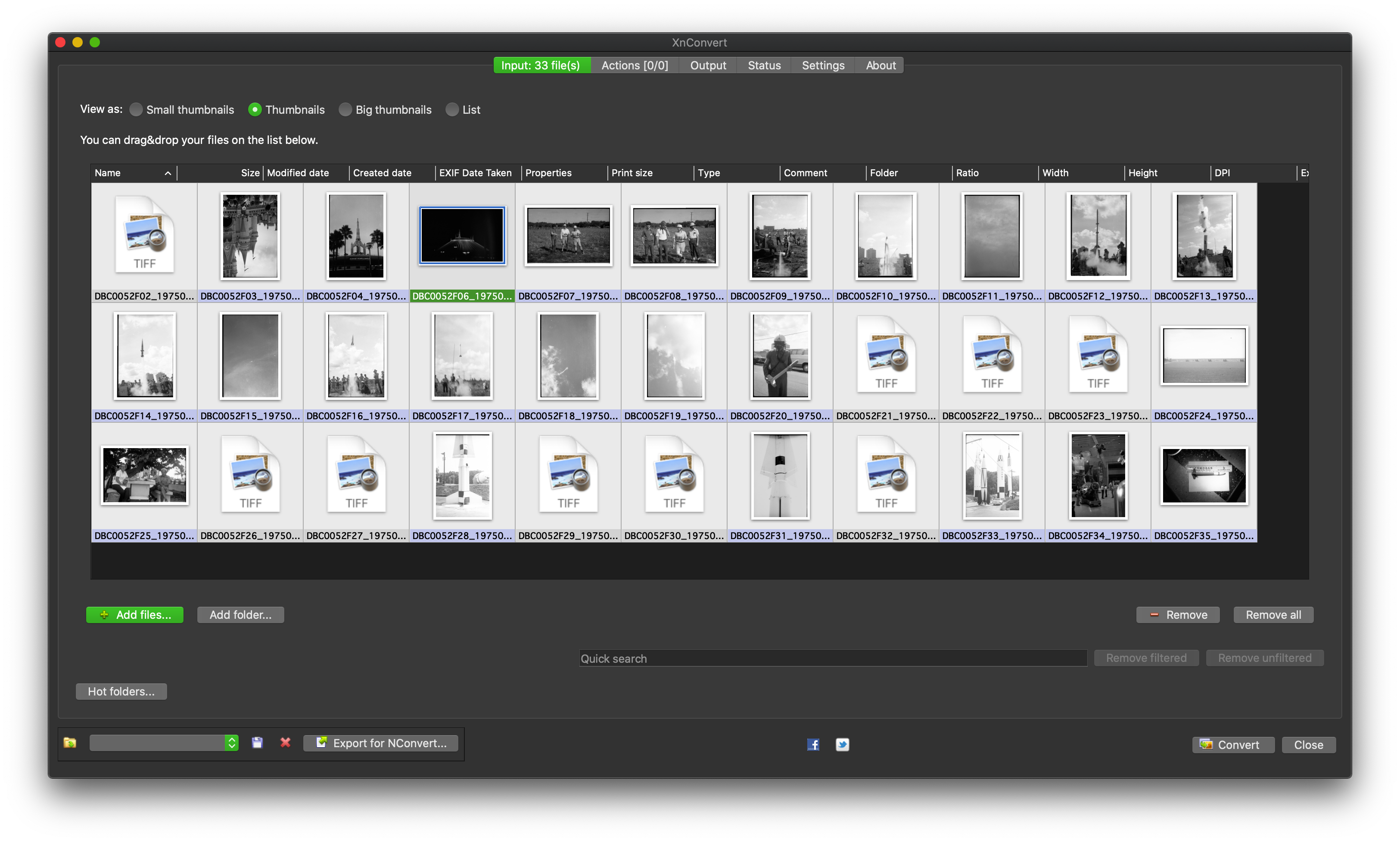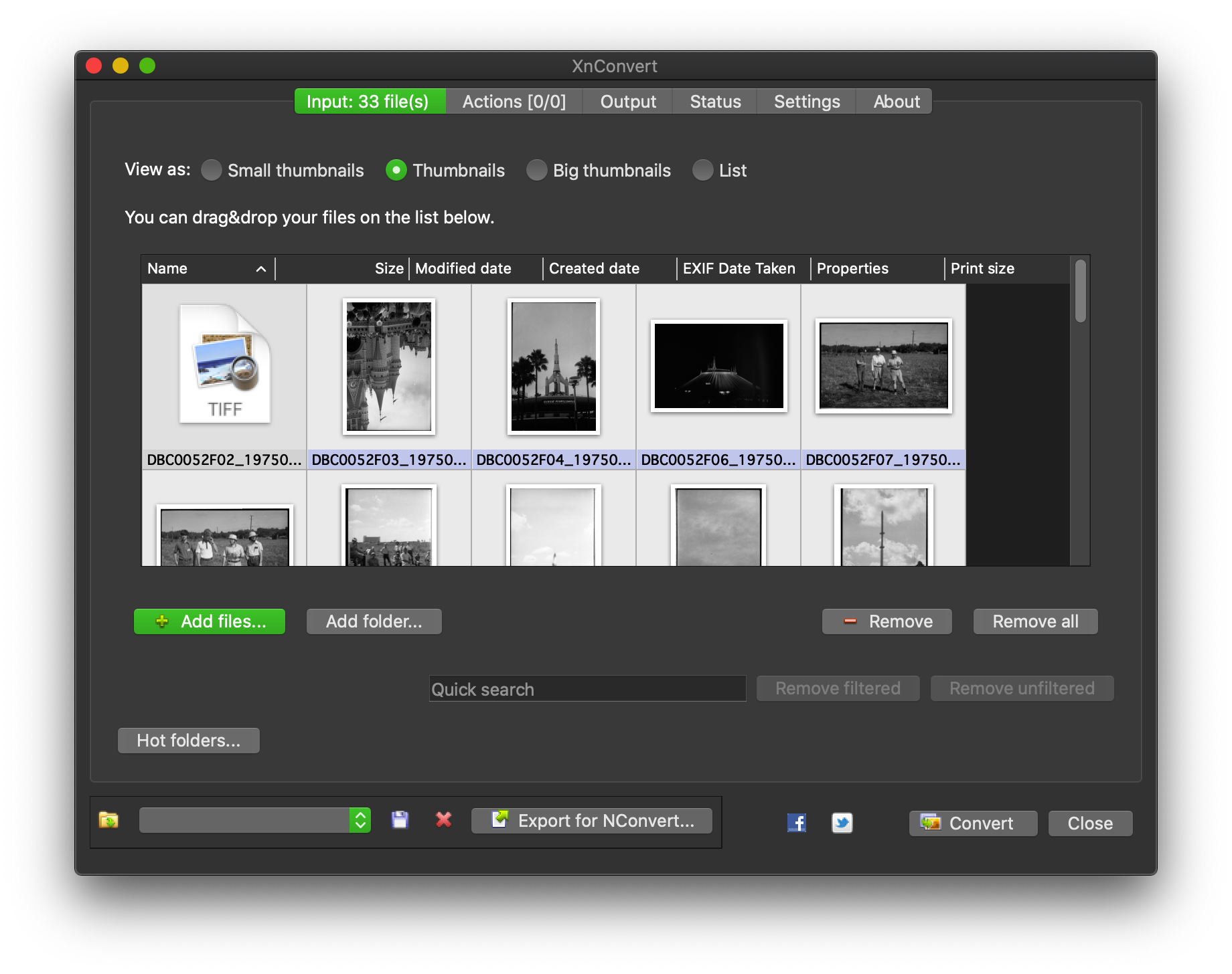 2) [bug] I have at least one .tiff that kills XnConvert instantly when you add it to the Input tab (before I even try to convert it); you get the "XnConvert has quit unexpectedly" system dialog. It looks like this happens while XnConvert is generating the preview thumbnails for the input tab. I'm trying to isolate the specific file from the batch but that's tedious, though I imagine you'll want the file. I can view them all in Mac Preview so it doesn't seem fundamentally corrupt.