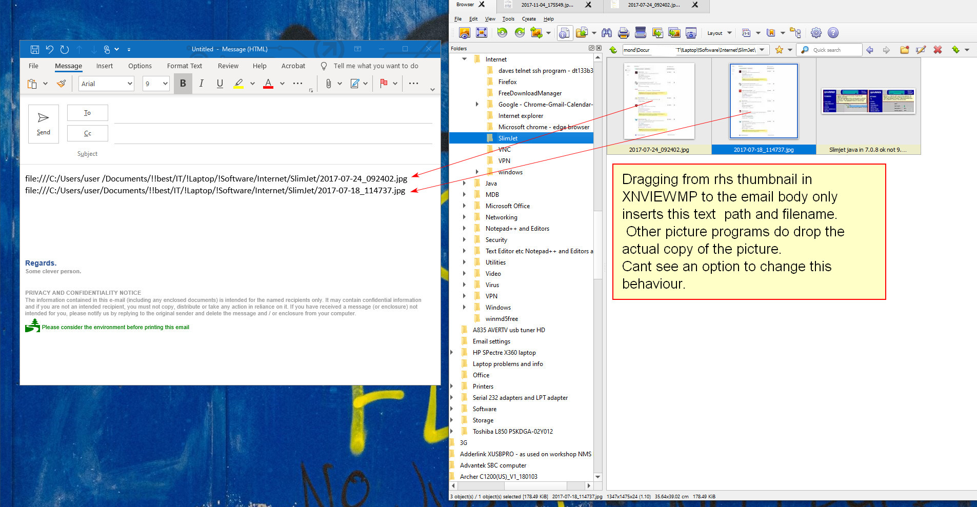 I just find the drag and drop from the xnviewmp thumbnail into the message body would be better if the actual picture was inserted there. But its a quite minor problem now i have discovered a way to make it work. Of course it maybe my inexperience or thickness of understanding!