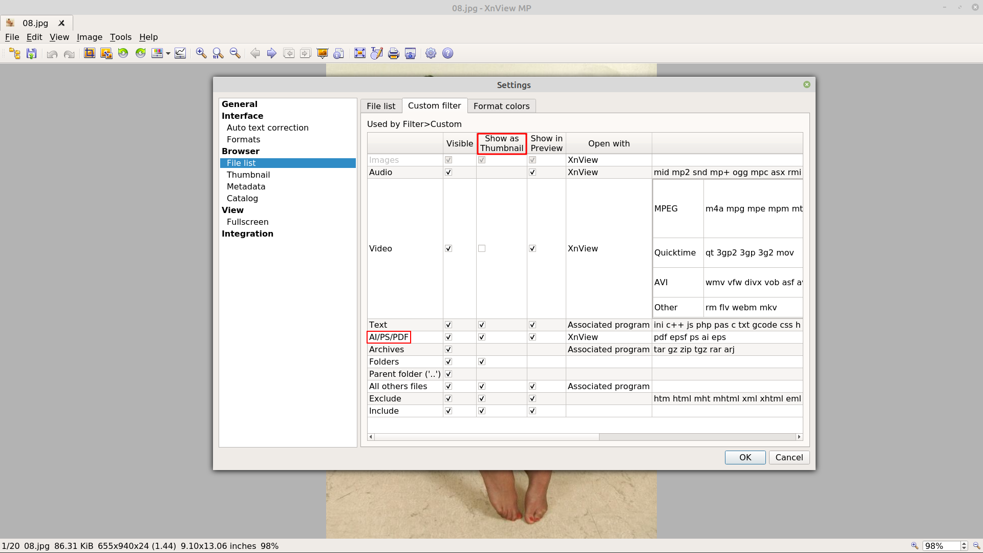 Before doing that, could you ensure that in the viewer, File > Format settings... -- Read tab the option Ignore read errors is enabled in case the PDFs you are testing are possibly malformed, even if they open in other applications, then if necessary test again preferably with multiple PDFs.Lee James wrote: Thu Oct 22, 2020 9:32 pm No, I can't view or preview PDFs in any way in XnView.