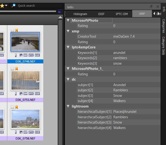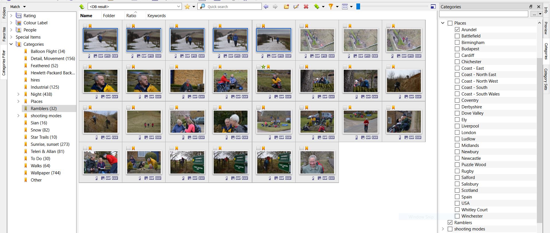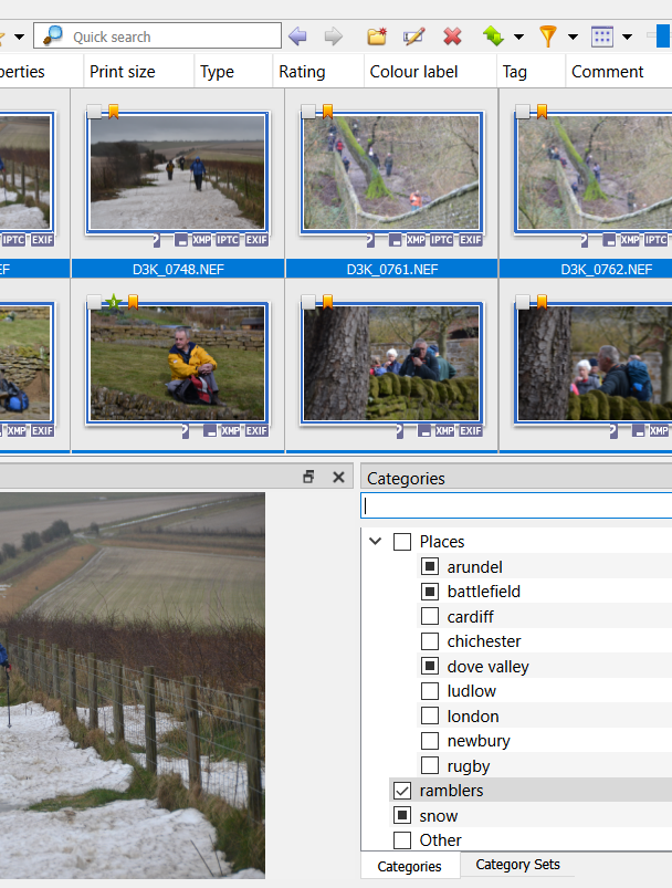 If I now click on the category Ramblers I get walkers from many locations (so far, so good). If I use Quick Search and type in Place1 then that works, as does Snow. If I type in Place2 or Place 3 then nothing is found. These are the categories exported from XnView (the actual places are under a main category called Places; the other three are categories at the same level as Places):