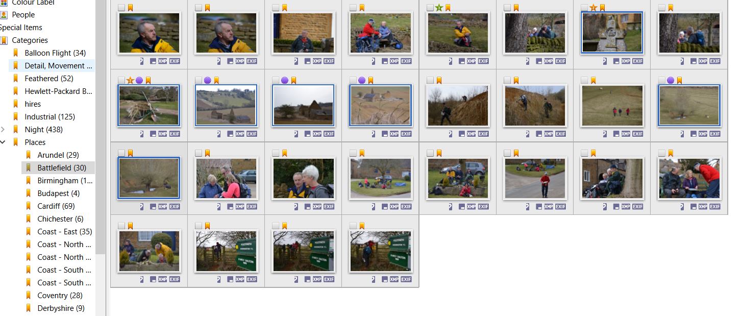 Category Battlefield selected, showing 30 files. The 23 images containing people can be seen plus 7 which contain only landscape (highlighted). If I type Rambler into the quick search then no images are shown.