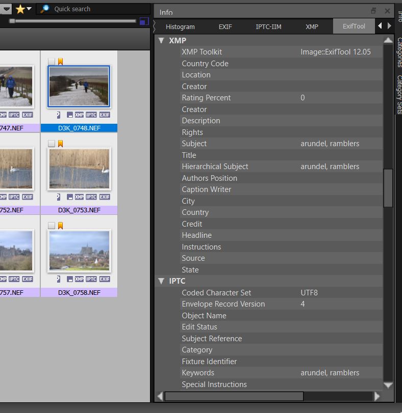 If I select an image and look in the Info tab then look under IPTC-IIM, XMP and ExifTool: