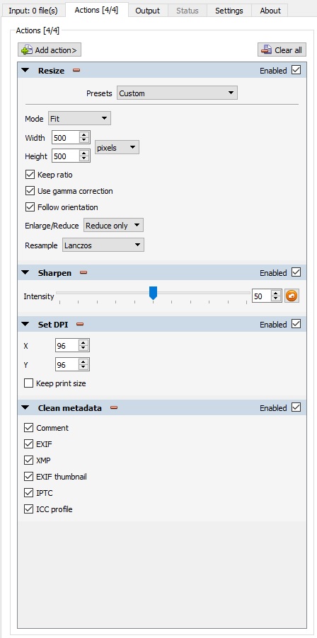 nconvert -ratio -rtype lanczos -rflag decr -rflag orient -resize 500 500 -sharpen 50 -dpi 96 -clean 95