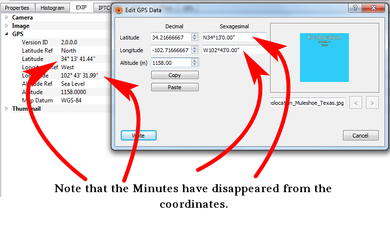HOWEVER, and this is wherein the fatal flaw lies, in the GPS Editor, there are two columns of coordinates, Decimal and Sexagesimal; when I open the GPS Editor to edit/correct a file that already has coordinates, the Sexagesimal coordinates will have the minutes rounded to all zeros and the Decimal coordinates will reflect this rounded off position, even though the pinpoint accurate coordinates are showing accurately in EXIF data.