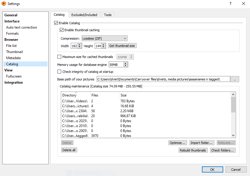 2)If you want to renew the whole catalog, you can move or delete xnview.db (close xnviewmp, remove the file, start xnviewmp)