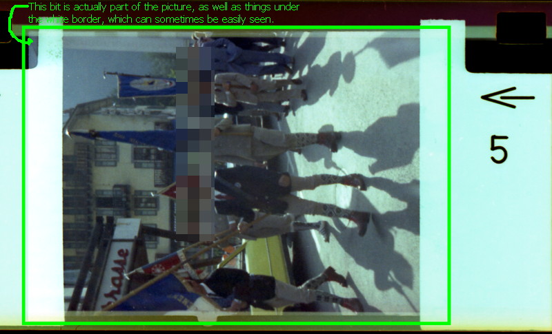 I'm scanning negative films, and using the great XnView Classic to set better colors. Scanned negatives usually have borders that cover a larger picture taken on the negative film (see picture below, outlined in green you can see the whole picture, though there would have been better examples I confess! ).