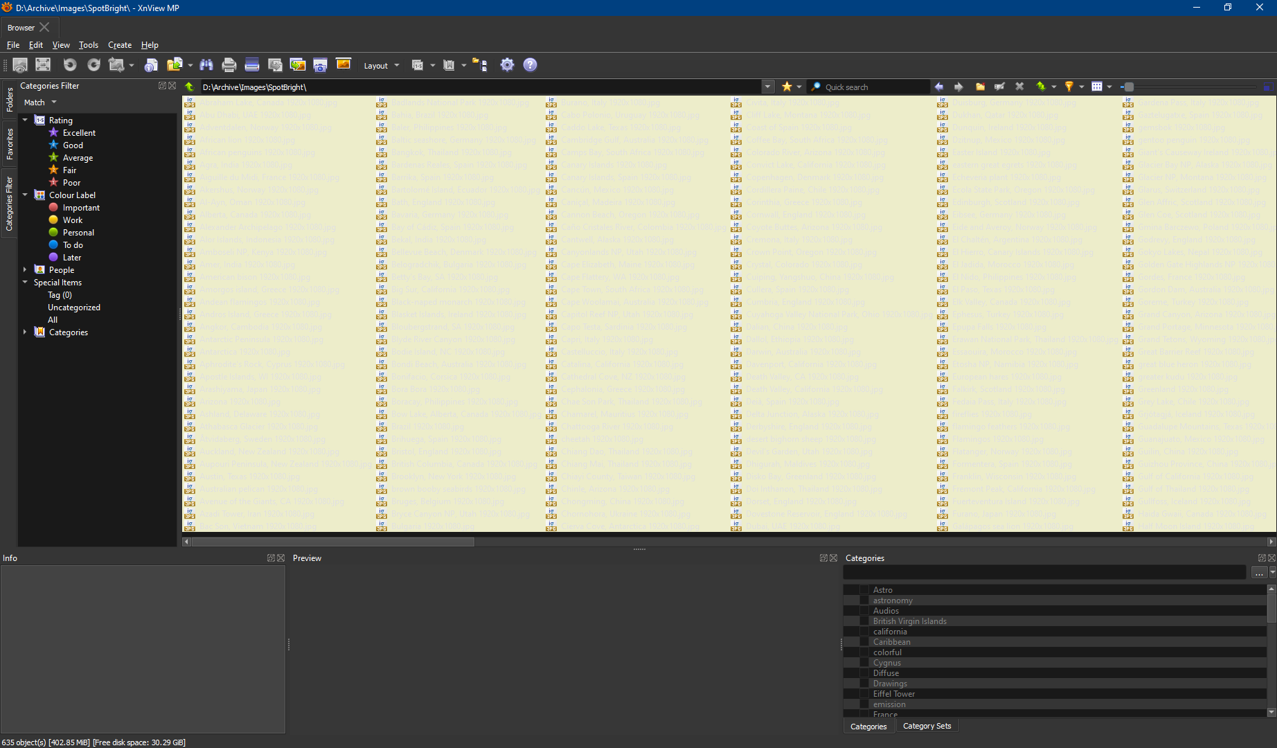 1. When the Dark or Black theme is selected, and the Details view is active, XnView MP renders all file names in white, even though the user preferences specify other colors. (Other views are okay.)