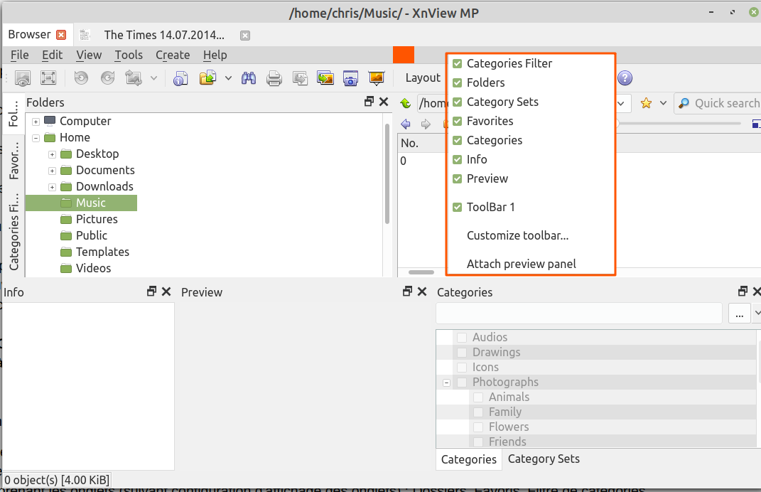 Nota : je crois bien dans mes tests avoir détaché les onglets "Catégories" et "Groupes de catégories" pour le transformer en fenêtres flottantes, il me semble que c'est là, après avoir cliqué l'appli dans la barre de tâches pour faire remonter xnviewMP en premier plan que les fenêtres flottantes ont disparu et que je n'ai pas trouvé de moyen de les relocaliser. Cela reste une hypothèse qui dépend de ma mémoire des opérations, en effet j'avais oublié cet épisode.