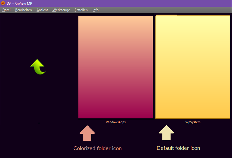 That color setup could actually be useful for XnView in general as I saw a few mentions in the past threads of "custom folder icons" instead of the default yellow one. Thumbnail background/border already can get color adjusted in the XnView settings menu itself, the folders to be customizable would be pretty nice as well.