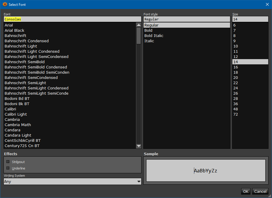 Press button for font selection (in this and in other panels). Then, you can choose font, size, etc.