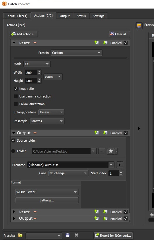 There have been regular requests to enhance XnConvert to provide a way of creating multiple output versions from a set of inputs, a common need case being to enable output of alternative versions with different pixel dimensions for use on the web.