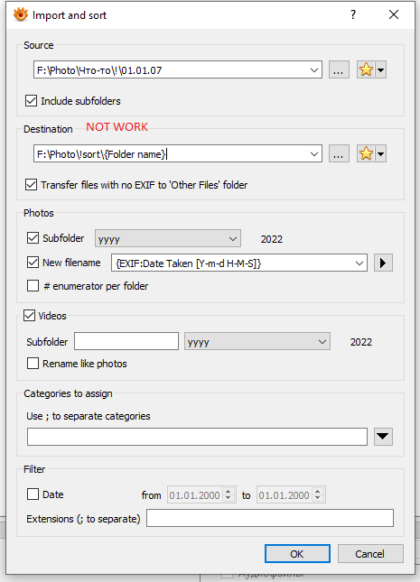 When I using "Import and sort" feature and choosing "New filename" with this value "{Folder name}\{EXIF:Date Taken [Y-m-d H-M-S]}"