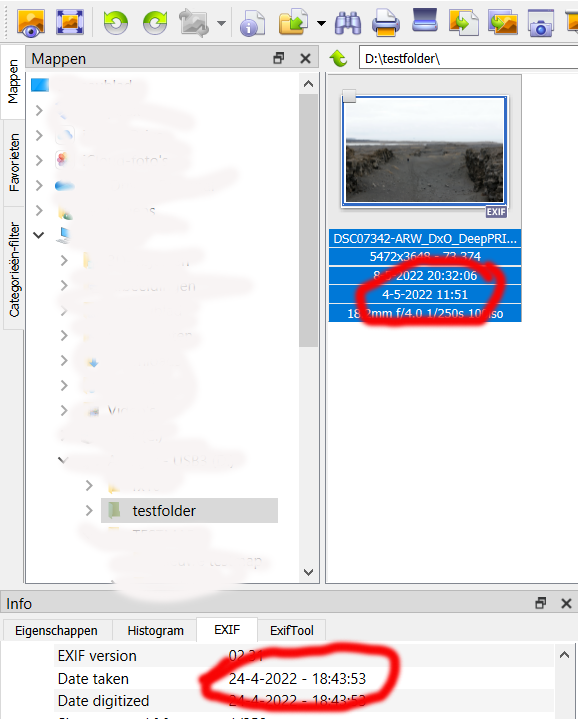 Hi Pierre, I am sorry, I do not quite understand what you mean... Do you mean within xnview? I didn't change anything there. I think the one circles is the time it is taken on (which is the correct time on the camera only I forgot to change the time zone, so it should be 2 hours earlier; it is not the correct time underneath the photo in xnview and not the correct time afterwards when I look at it in explorer on my windows computer)