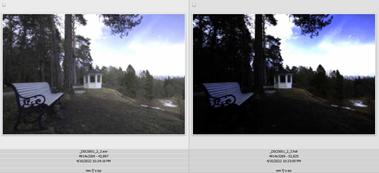 1. Same 32bit image saved as HDR format looks dark versus EXR format.