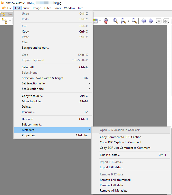 The top screenshot shows XnView MP, the lower screenshot XnView Classic...cowboymug wrote: Sat Jul 27, 2019 7:23 am In the tutorial I'm given, there is an option edit - metadata - remove all metadata.