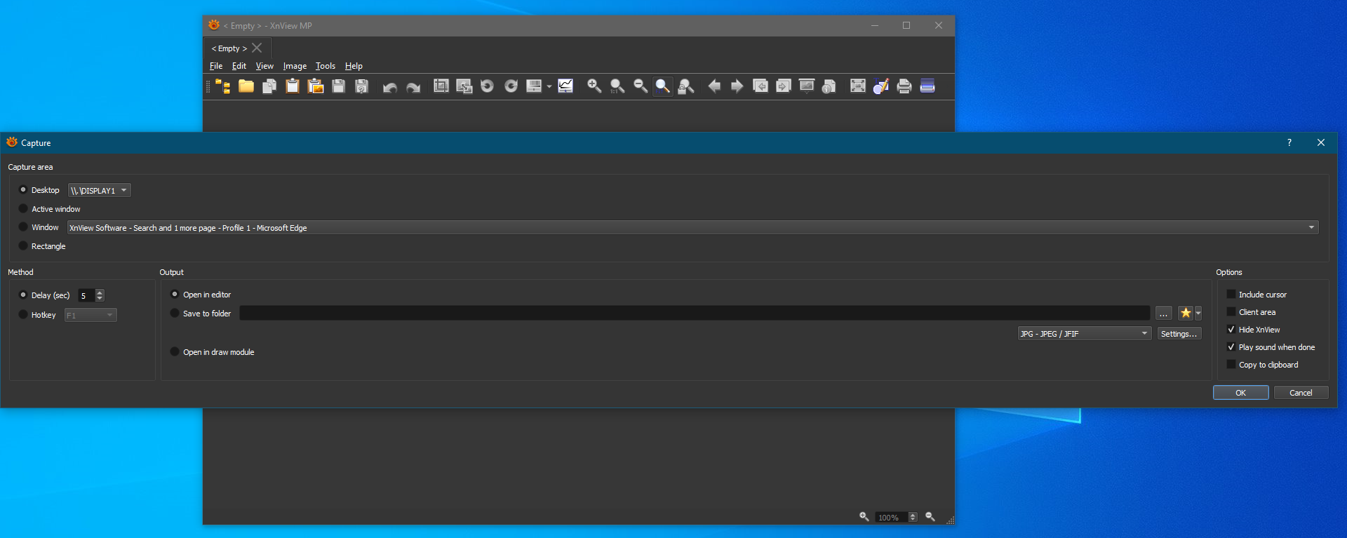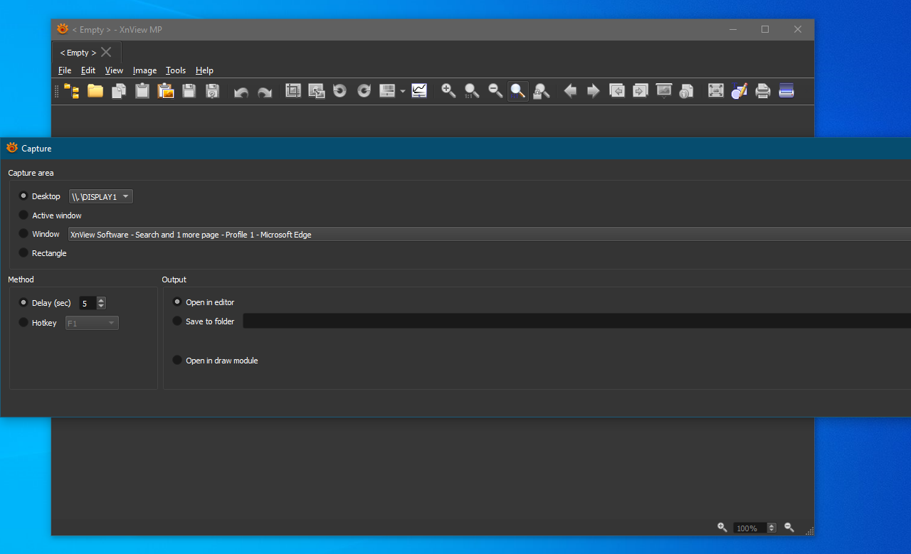 When the XnView MP window is on a 1920x1080 display, when opening: Tools > Capture...