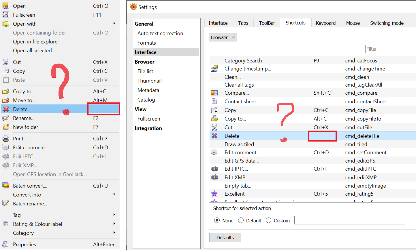 Delete action binded on Del key, but this connection is not represented in UI (in file context menu and settings)