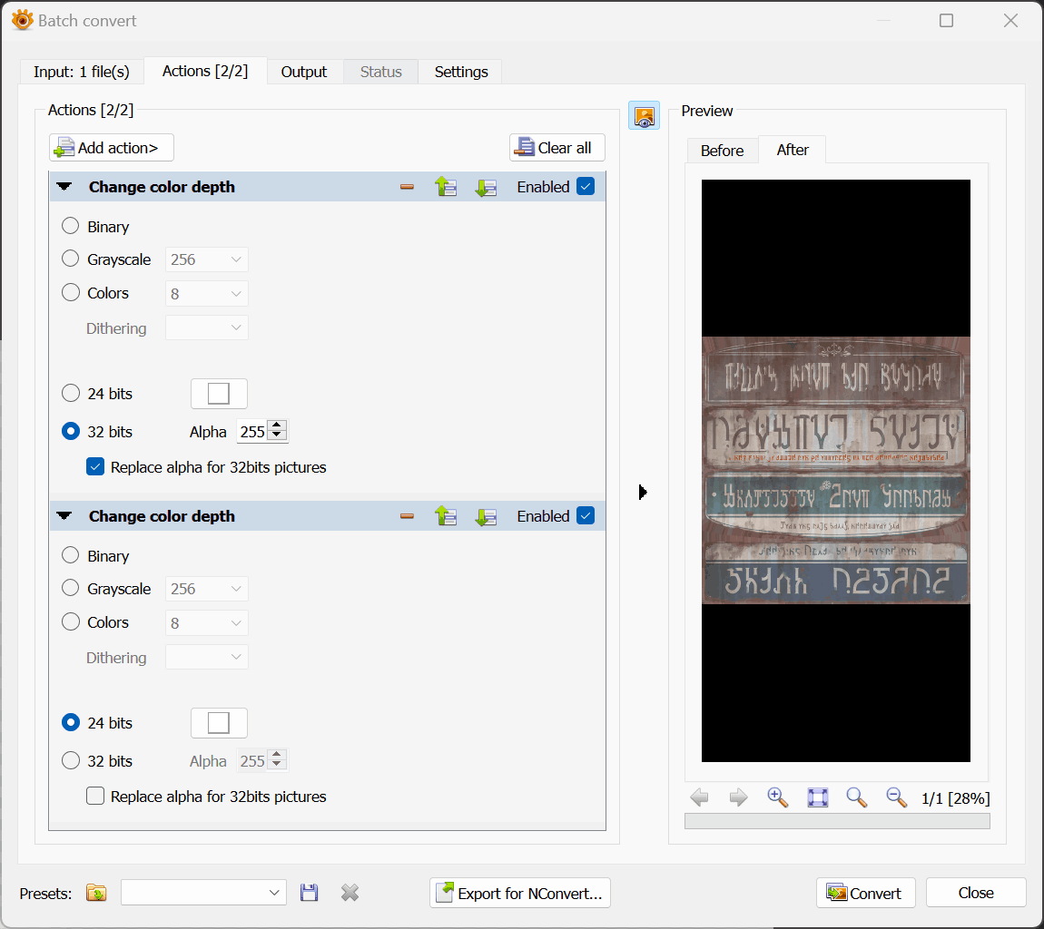 I need this action too, and I want to using it on 23,875 files in 1,729 folders, and "Change color depth- 24bits" can't do that, I put a file here maybe you can try it.