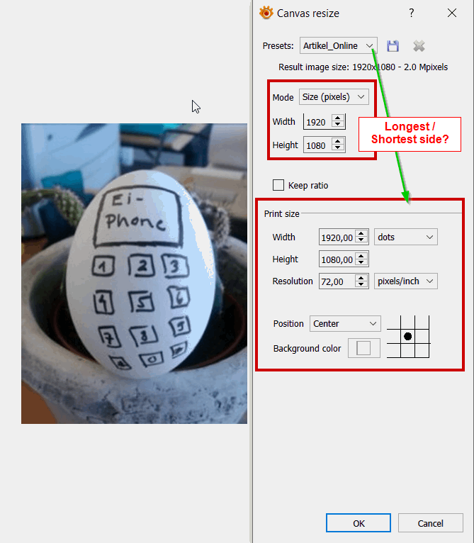 Taking one number from "Presets" shows Canvas option "Position" is always "Top left" for the the image. But we need Canvas around with image centered...