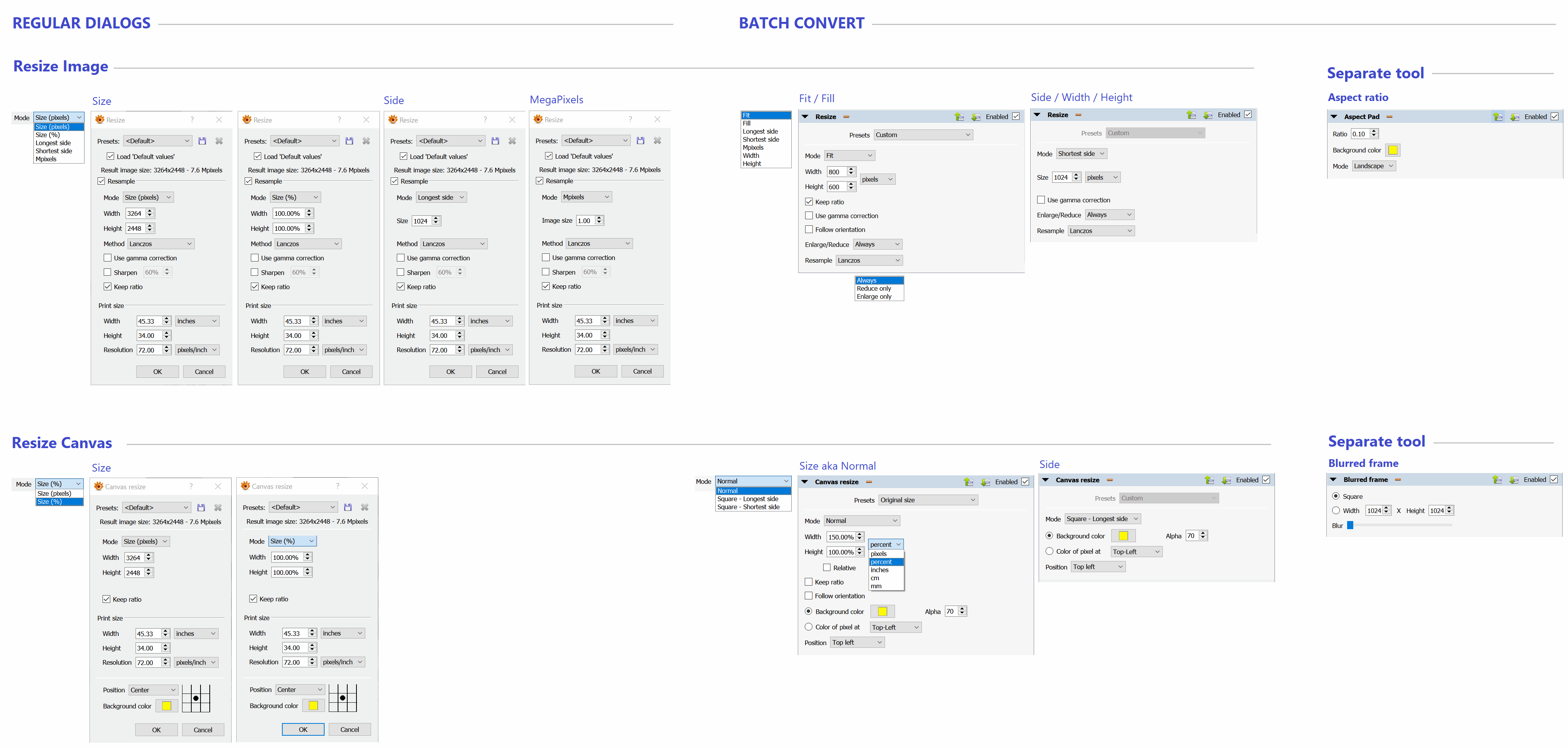 There are some difference in resize functionality between regular Resize and Batch convert dialogs.