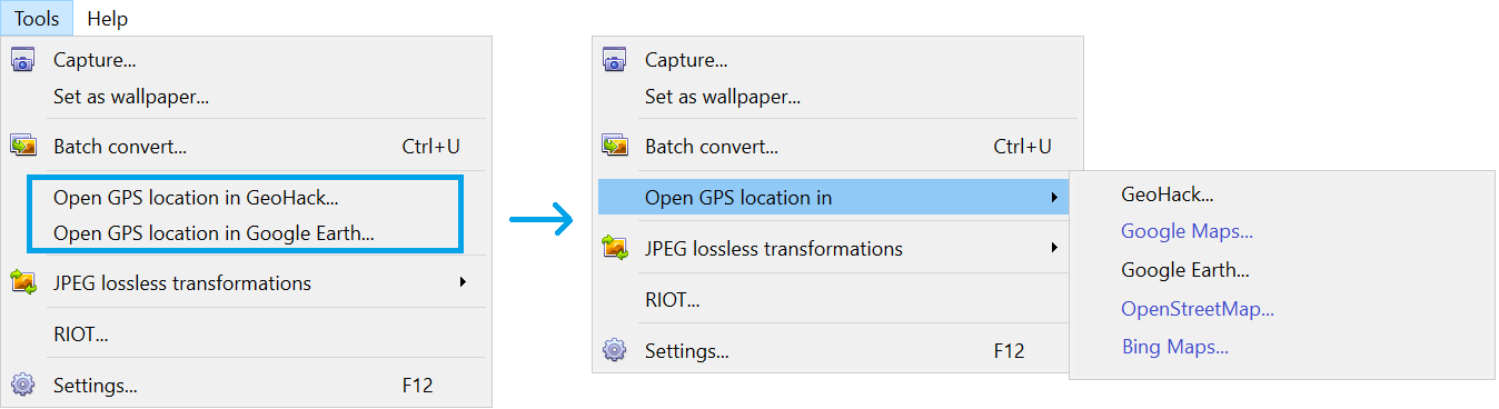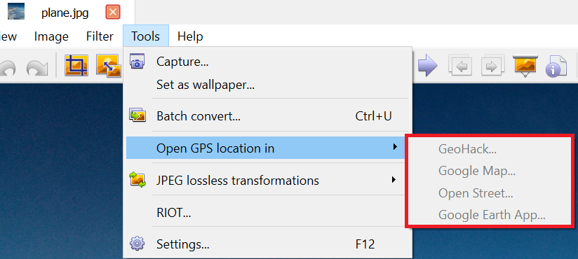 Viewer mode, check menu Tools → Open GPS location in → all options are disabled