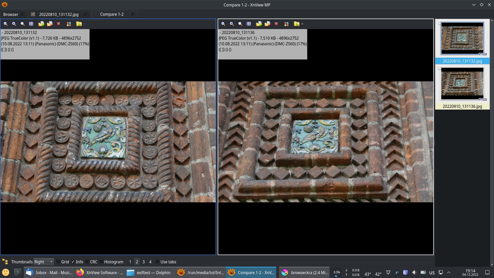 The only thing I'm missing from FastStone image compare is that XnView resets image adjustment position when we change zoom. For example, if we zoom 2 images a lot to see one object that is positioned in different places, we use right mouse click to position the object on both images to the center. and then compare it. Now if we zoom in/out even slightly, out adjustment is reset and we have to adjust again, and it takes very long at higher zoom. Faststone keeps adjustment, so if you move the image so that the object is in the middle on both images, you can zoom in and zoom out, and the object will always remain in the middle. This helps very much to zoom a lot and see what photo has better focus and less blurring.