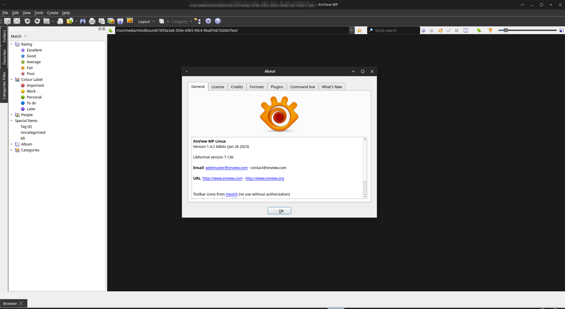 2. Start XnView while using XFCE 4.18 environment, making sure QT_QPA_PLATFORMTHEME env. variable is set to gtk2 (xubuntu has it on /etc/X11/Xsession.d/56xubuntu-session), complete initial setup if prompted, make sure theme selected during setup is default