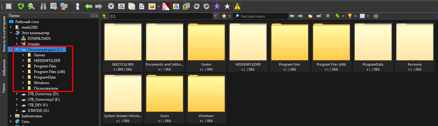 If you restart the program with the button pressed, then some folders start to appear in the directory tree, but still, for some reason, not all of them.