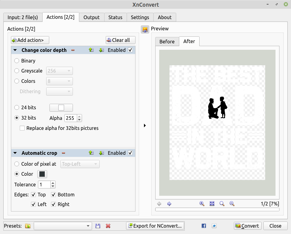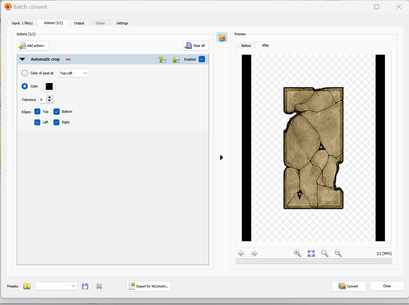 But I have always found 'Automatic crop' difficult to understand, and in other XnView software have sometimes had to use surprisingly large tolerance values. In the above image with those settings I don't see the expected cropping to the outline of the white text.