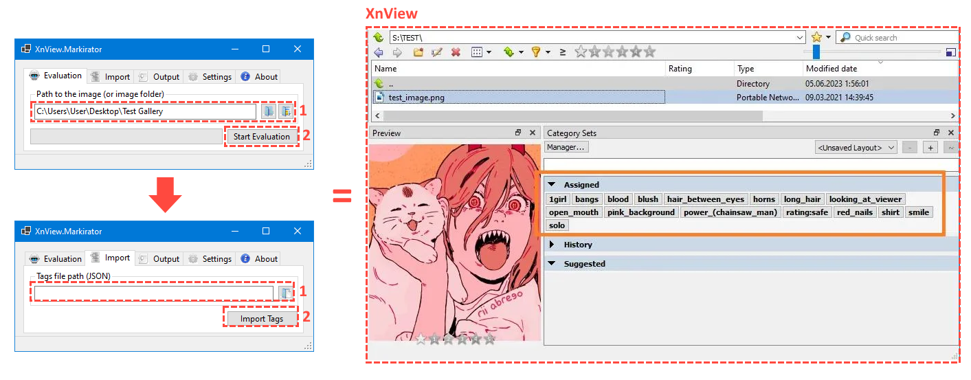 Hi all, I made a simple application to integrate DeepDanbooru (image tag estimation system) and XnView. Also its possible to use it to simply assign categories (tags) with XnView via JSON files. So I would like to share it with the community.
