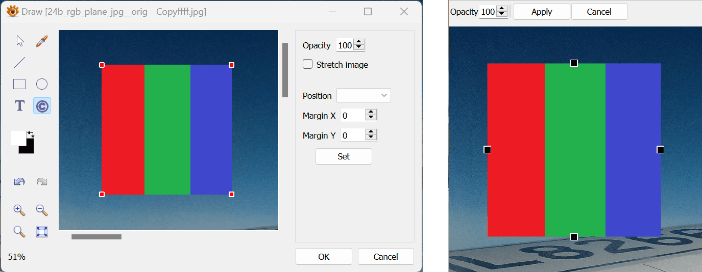 I am using various PNG watermarks with transparency. When I use the top middle box to resize the Watermark it gets constantly repositioned further to the top. Keep dragging the anchor and resizing larger/smaller to see the effect.