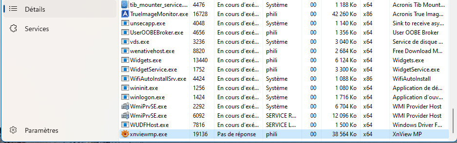 Grace a votre aide, j'ai réussi a trouver le logiciel qui empêchait le bon fonctionnement de XnViewMP64, c'est Paint de windows11-64 en version 11.2304.33.0. Il y a conflit d'ouverture d'images entre les deux logiciels en 64 bits alors que tout fonctionne bien en 32 bits. J'ai désinstallé Paint, ce logiciel ne m'étant d'aucune utilité.