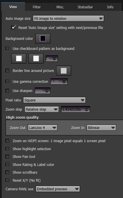 This was the setting I used, but it doesn't affect either way even when I choose another one like none, bilinear etc. The sharpening setting doesn't seem to have an effect either - after changing a setting I also close XnView and start again to be sure it applies.