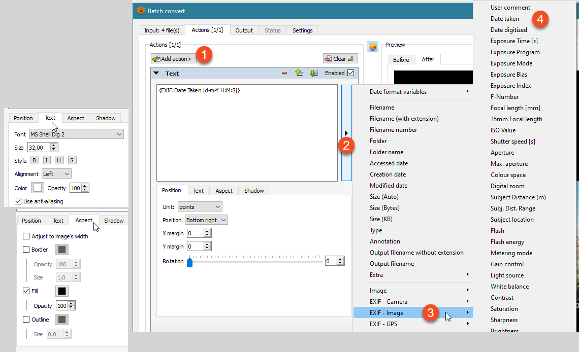 When only a few photos/screenshots, I create in Snagit and then add the date-time manually (add a text box, with the date time).