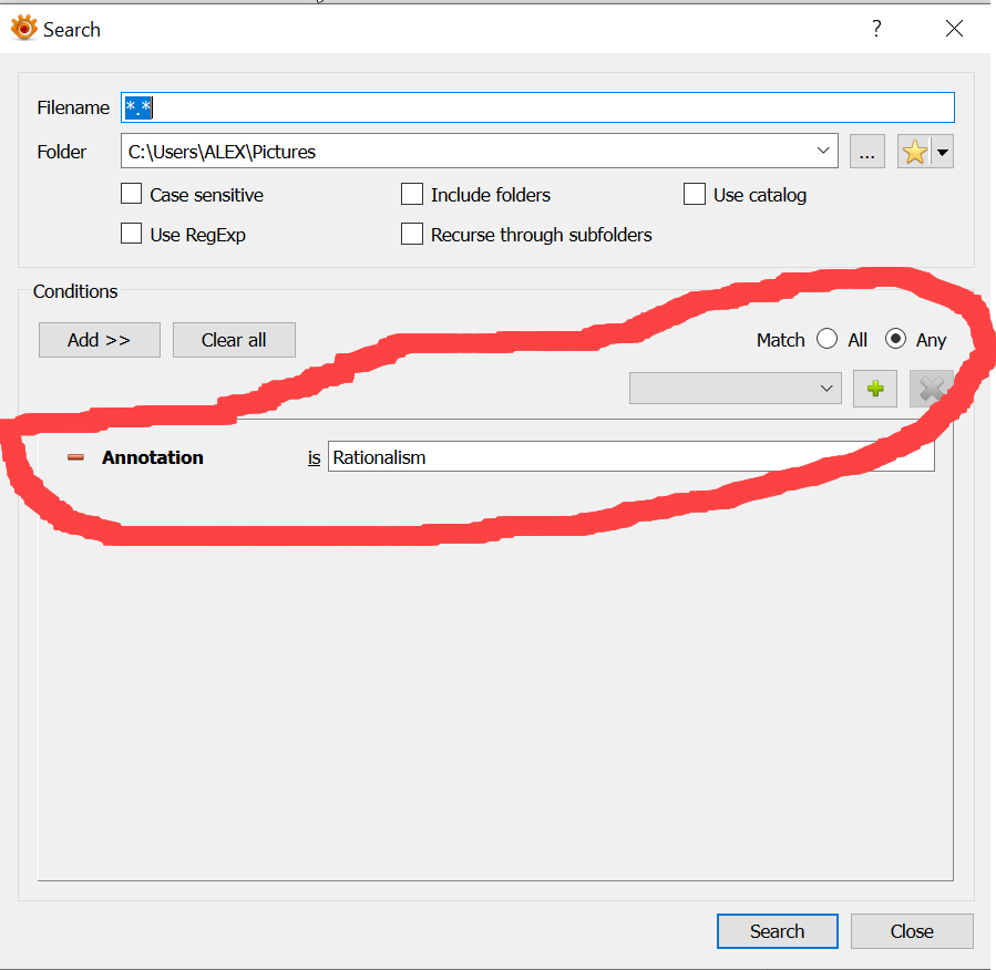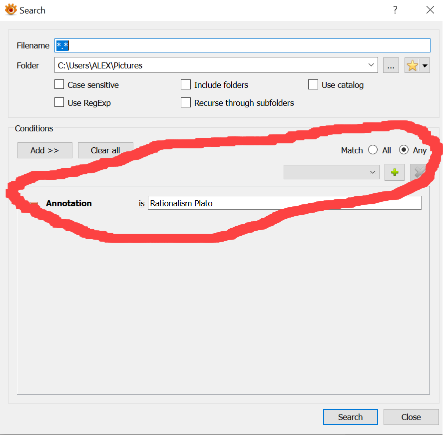 Again, even if ANY is being chosen, MP can search only for the both: Here, these are "Rationalism Plato"; thus, missing even one of them results in 0 file(s) found, s. the attachments. - One needs 2 terms at once even if ANY is switched to. The same meets not only for Annotation, but also for Comment.