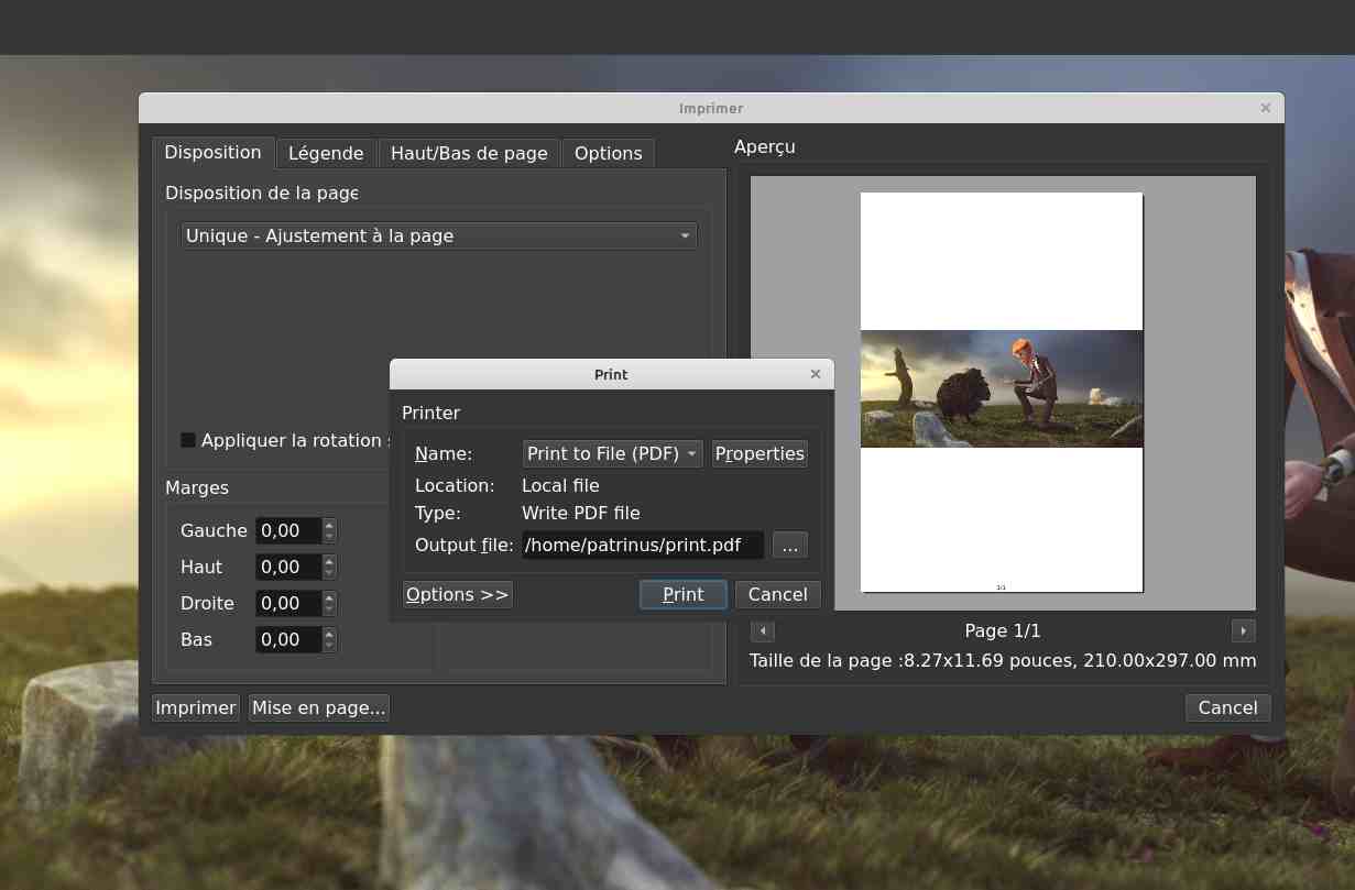 ....sans passer par un fichier pdf : Sur Linux Mint 21.3 quand je fais imprimer, je n'ai pas le choix de l'imprimante car le bouton imprimer après les réglages de dimensions n'affiche que le choix "Print to File (PDF)" !!! alors qu'avec GIMP ou Xviewer, j'ai accès aux différentes imprimantes cable ou réseau !!!