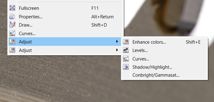 Yes, I customised the context menu and there are two 'Adjust [menu]' available as shown in image (and by user0).xnview wrote: Fri Mar 01, 2024 10:26 am by default there is no 'adjust' in context menu, so it seems that you have modified it in 'Settings>Context menu'